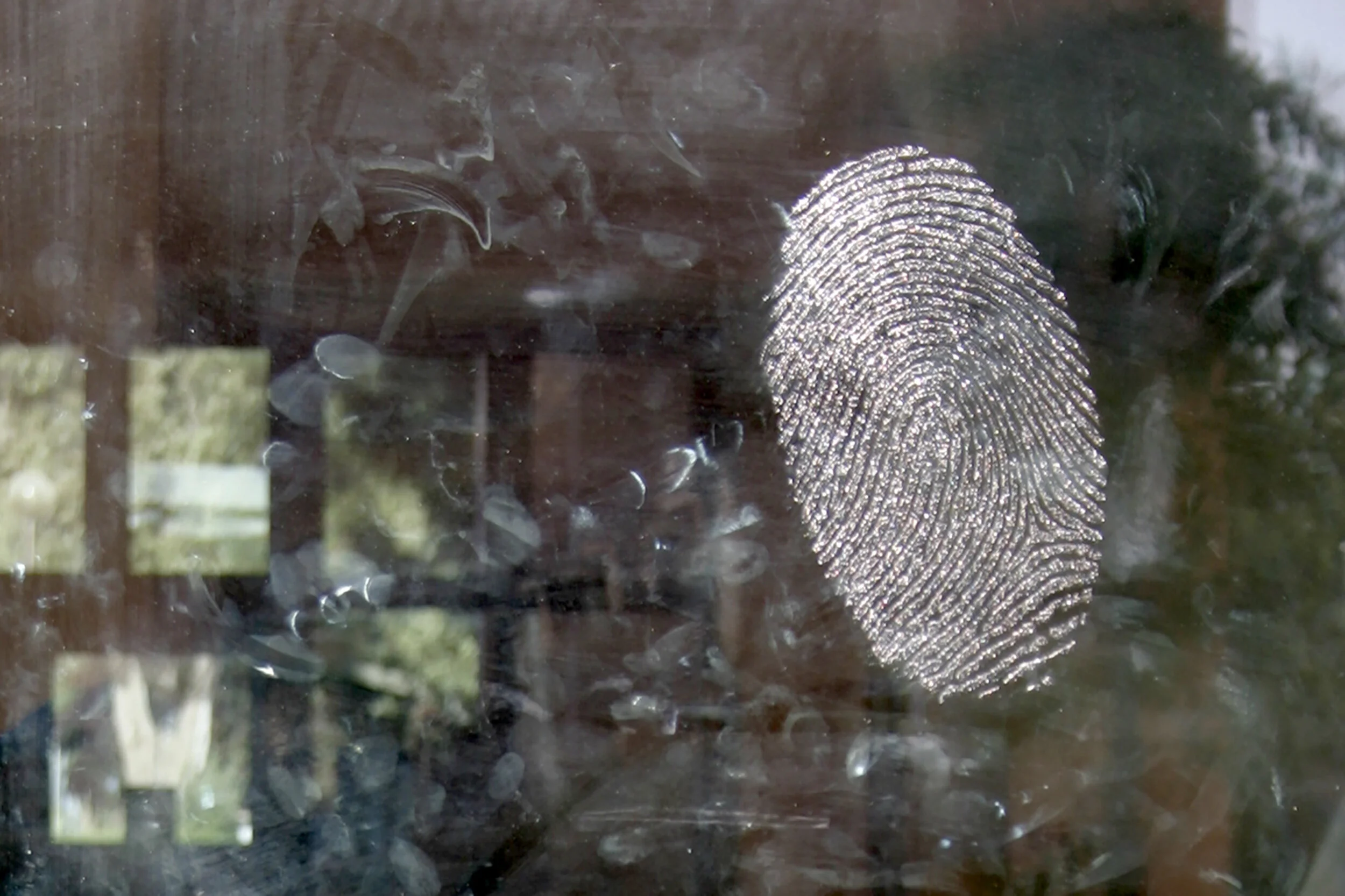 Giant rubber stamps made from the artist’s pinky and index fingerprints were used to make oily, oversized prints around University of California Santa Barbara’s campus and other locales.